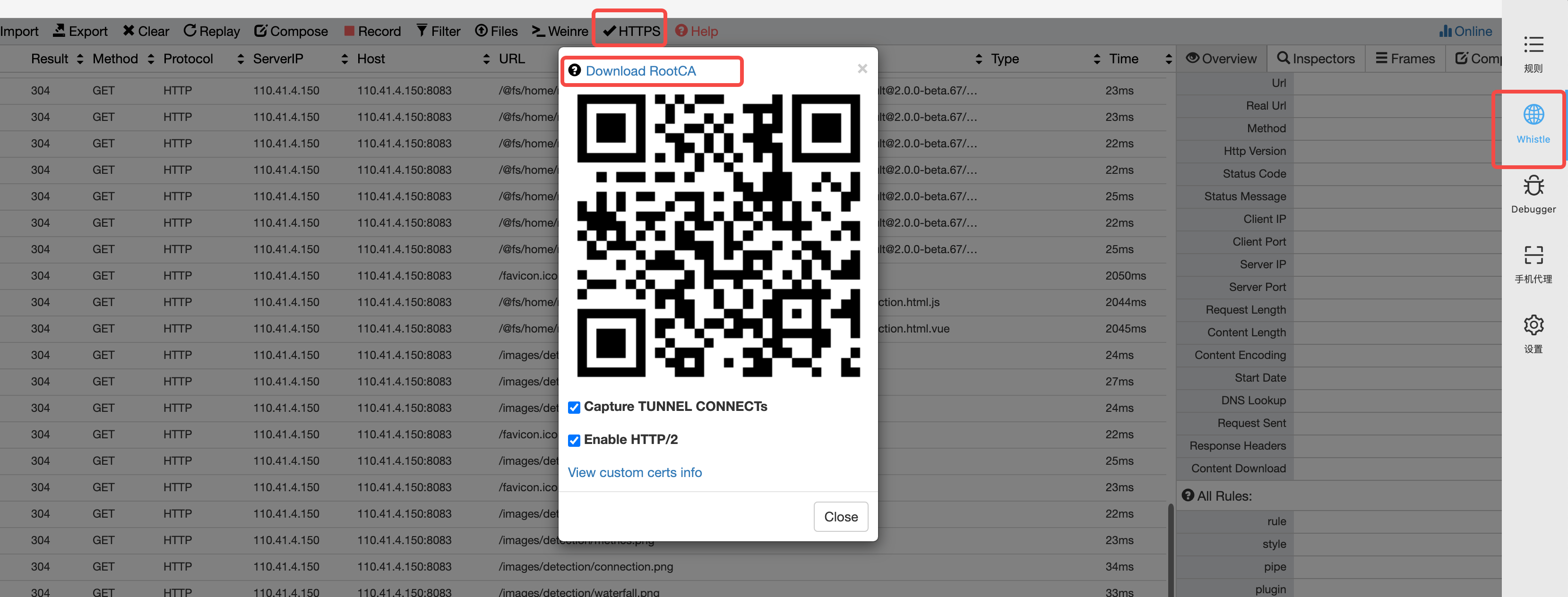 [注意] 手机抓包HTTPS时,需要在桌面端安装whistle根证书才能抓包HTTPS https://wproxy.org/whistle/install.html